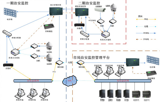 平安城市項目是一個(gè)長(cháng)期建設與維護項目,公司目前主要負責第三期建設與一期改造,將一期建設的系統融入二期新系統中,實(shí)現整體協(xié)同作用。公司通過(guò)把采集到的各種視頻、音頻、信號等信息融入到客戶(hù)的信息管理平臺之中,根據城市區域、場(chǎng)所、道路的分布情況對不同地方的安全等級進(jìn)行劃分,提供相應的城市視頻監控系統解決方案,采購實(shí)現安防解決方案所需設備或使用公司自有品牌產(chǎn)品、并對整體系統實(shí)施安裝、施工、集成及其他定制化服務(wù)??傮w架構圖如下所示: