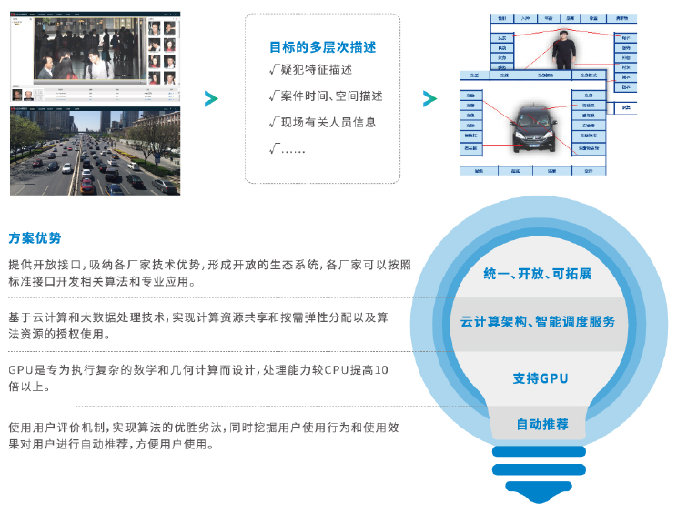 視頻圖像解析中心智能分析平臺是基于以視頻大數據為中心的,以服務(wù)公安業(yè)務(wù)為主線(xiàn)的,面向視頻圖像深度應用的智能分析平臺,其核心目的是為拓展和深化視頻圖像應用,提供“資源支持”、“開(kāi)放接口”、“應用服務(wù)”。